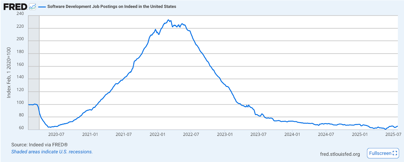Funnily, this chart almost looks like the inverse of the FRED “Software Development Job Postings” data above: a trough in 2021-2022, and a steady rise starting in 2023 (right when Chat-GPT was released).