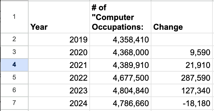 Using the Occupational Employment and Wage Statistics data from the BLS (insert obligatory “can we even trust that data?” caveat here) I charted out a quick look at the number of Americans employed in “Computer Occupations” in the United States from the same period as the FRED chart above. The data for 2025 isn’t available yet, but trends do seem to confirm the former camp: in 2024, the number of developers employed in “Computer Occupations” declined in 2024.