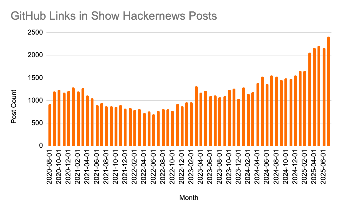 We may not have government-sanctioned data, but there are still ways to try to directionally assess this. In fact, we can keep things in the YC family, and look at aggregate post data from Hacker News, the Reddit-esque forum focused on startup founders. In 2021, Hacker News made their dataset available on Google’s BigQuery to anyone looking to run analysis on it. With the help of Chat-GPT, I ran a query to determine the number of posts on “Show Hacker News” that link out to GitHub, as an attempt at proxying the number of “solo” or “small team” developers who are actively working in public. If you regularly look at Show Hacker News, you’ll know that the activity in aggregate is mostly developers looking for feedback and early distribution on their passion projects, rather than people sharing repositories of large, foundation/corporate-sponsored open source software. So it might be a decent indicator of whether the number of solo developers is increasing.