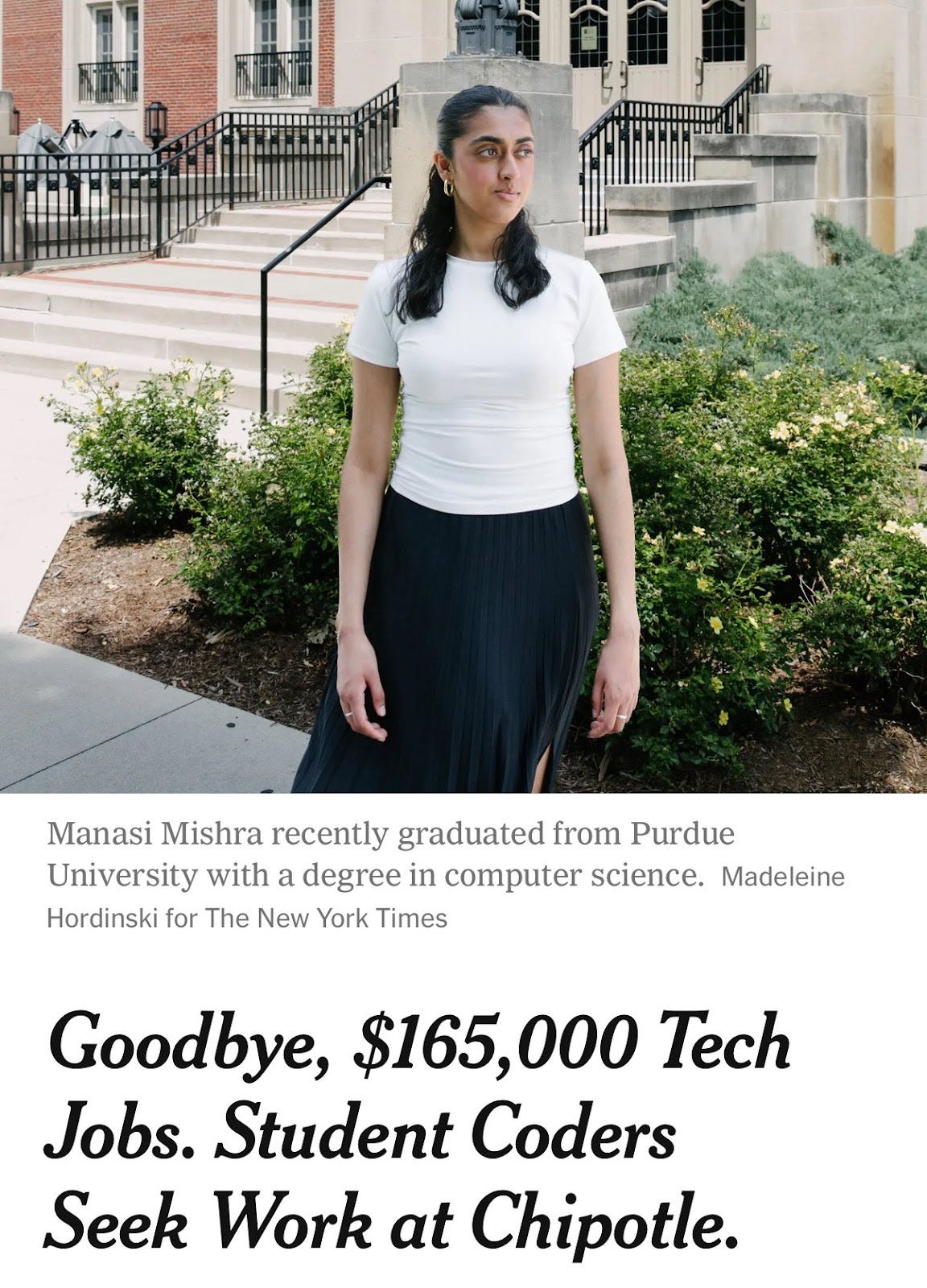 People are choosing to interpret this in different ways. In the “hysteria” camp, we have the folks who argue that students have been lied to, that opportunities are drying up, that AI is taking everyone’s jobs, and that time is limited to “escape the permanent underclass” (and that the equally dark Janus head of “permanent underclass” is “getting oneshotted.”). In the sanguine camp, we have the argument that new job postings are generally declining, and that the decline in jobs at traditional firms might actually be a good thing: it gives younger generations the opportunity to be scrappy, build opportunities for themselves, and perhaps even escape the one thing worse than the permanent underclass: a lifetime of being stifled.