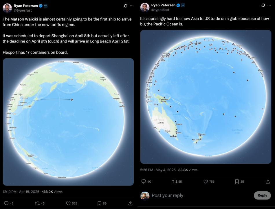 I’m beginning to think of this phenomenon as creative transparency. There are lots of different motivations for creative transparency: a company wants to dick-swing a bit, and demonstrate just how valuable the trove of data they’re sitting on is (the range of insights Ramp is sharing makes you both grateful that they’re being so forthcoming, but also makes you wonder, “what aren’t they telling us?"). It’s also a way to insert your company into whatever talking point du jour is trending. Ryan Petersen, the founder of the shipping company Flexport, engaged in creative transparency when he posted screenshots of their internal tracking system, which served as particularly salient fodder during the heyday of Trump’s tariff impositions.