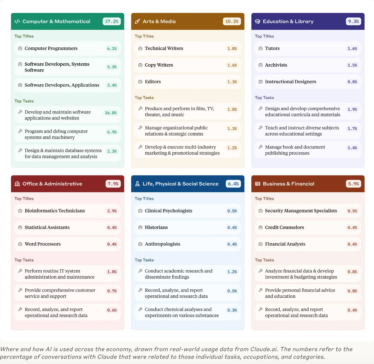 Other companies try to complement US government reports. Anthropic, for example, publishes the AI Economic Index, which tracks how professionals are integrating AI into their daily workflows. If you read through a recent publication from February on AI usage across the labor market, you’ll find a fairly intuitive story suggesting that queries on Claude are primarily driven by computer programmers and those in left-brained fields like math, followed by arts and media (which encompasses fields like technical writing) and education. This corroborates more colorful on-the-field reporting: the erasure of entry-level programming jobs2 (perhaps because developers using Claude and tools like it have cannibalized the new hire market for engineers) and of course newfound anxieties around students using AI to cheat their way out of an education.